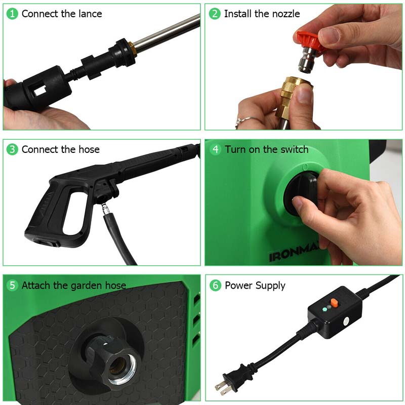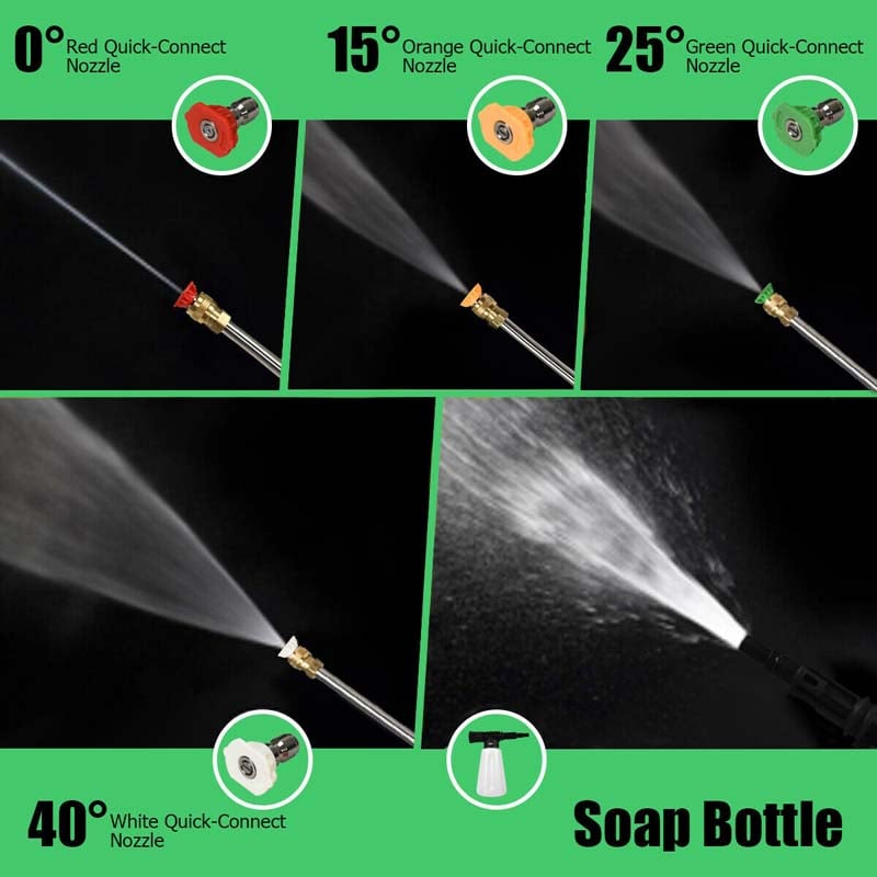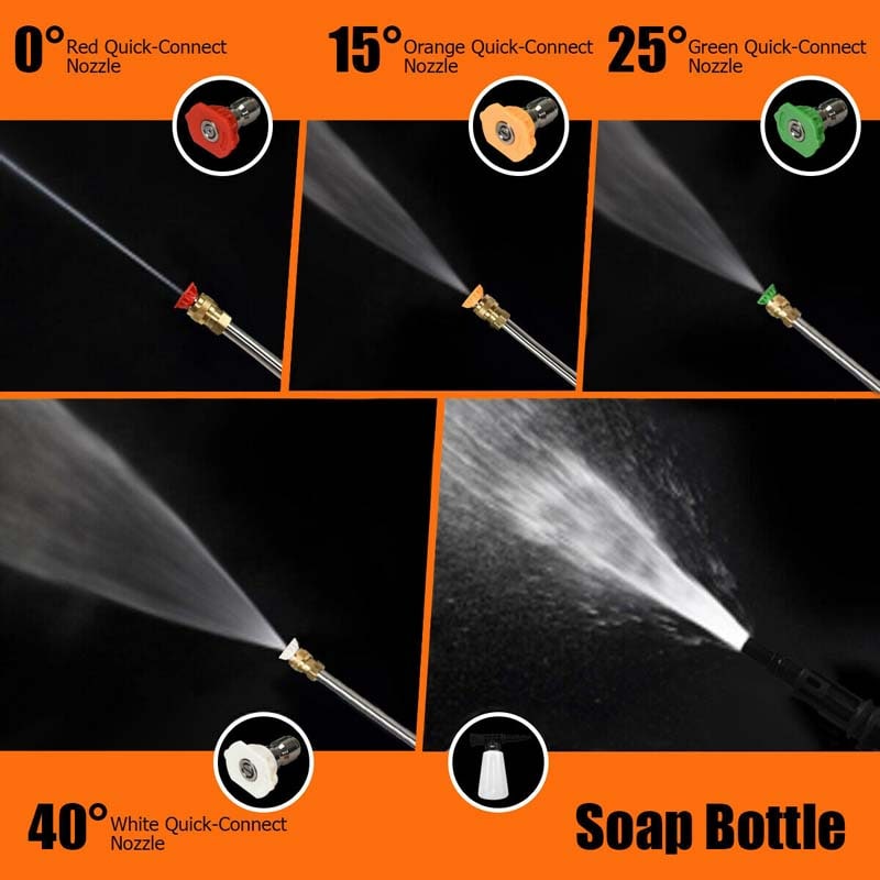 • 4 Interchangeable Nozzles & Soap Bottle: The high-pressure washer comes with 4 quick-connect nozzles of various sizes (0", 15", 25", 40"). It's useful for multiple scenarios making the cleaning process more efficient. Additionally, detergent or disinfectant can be stored in the soap bottle for deep cleaning.