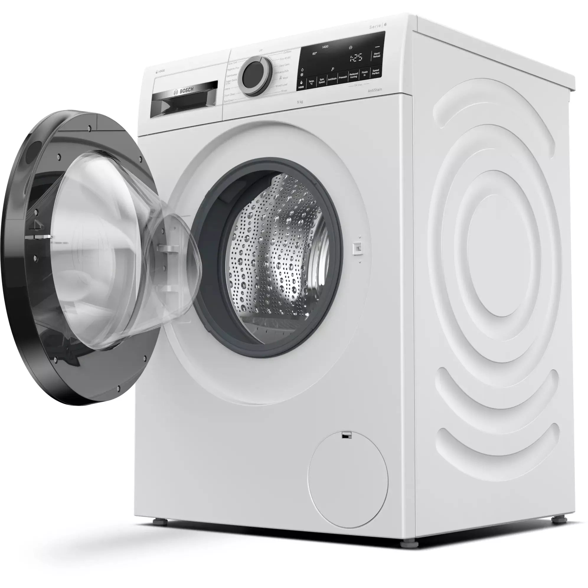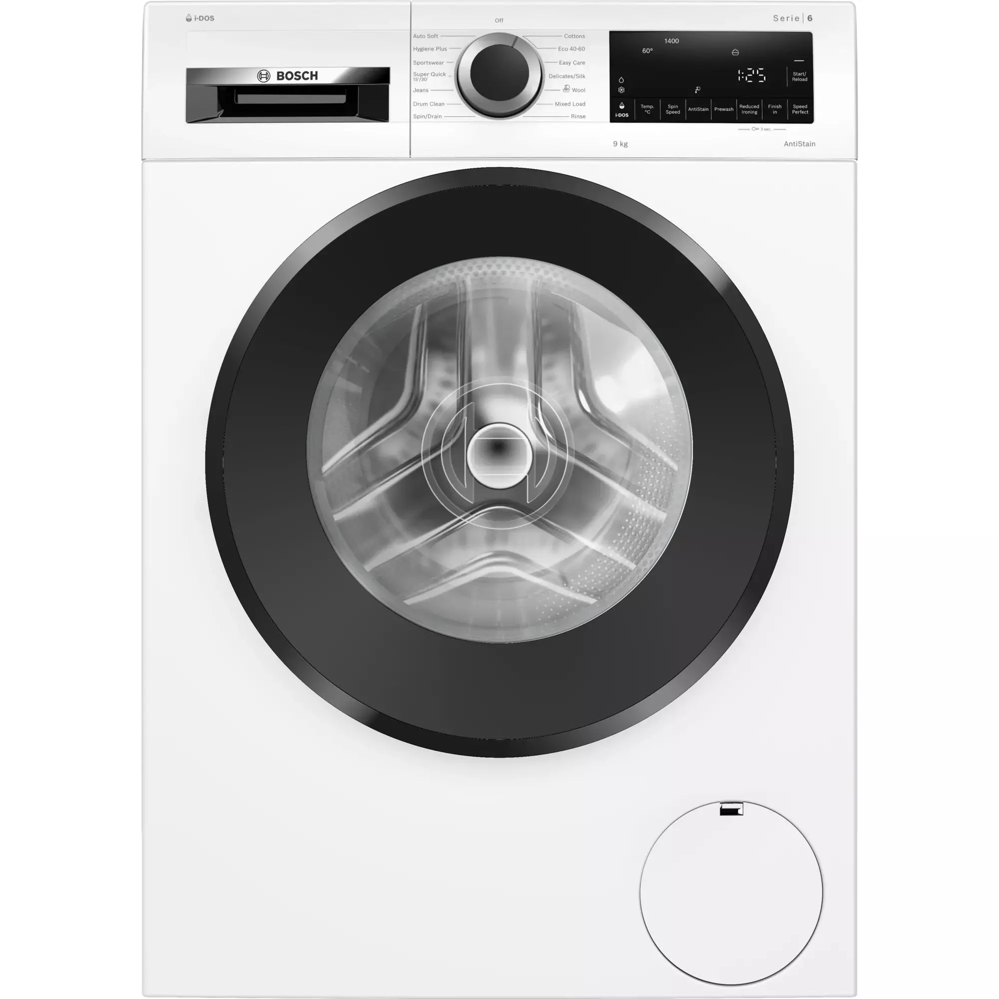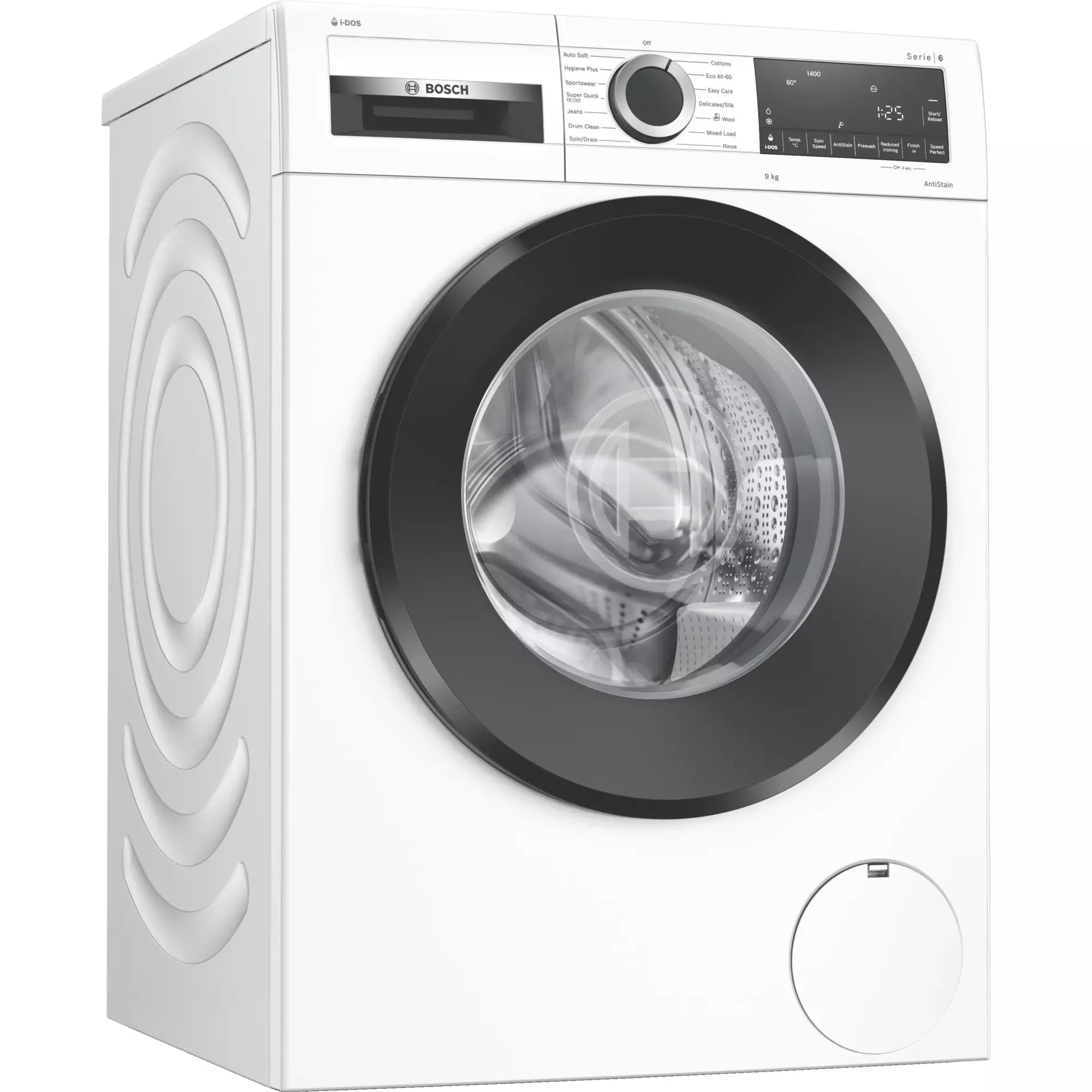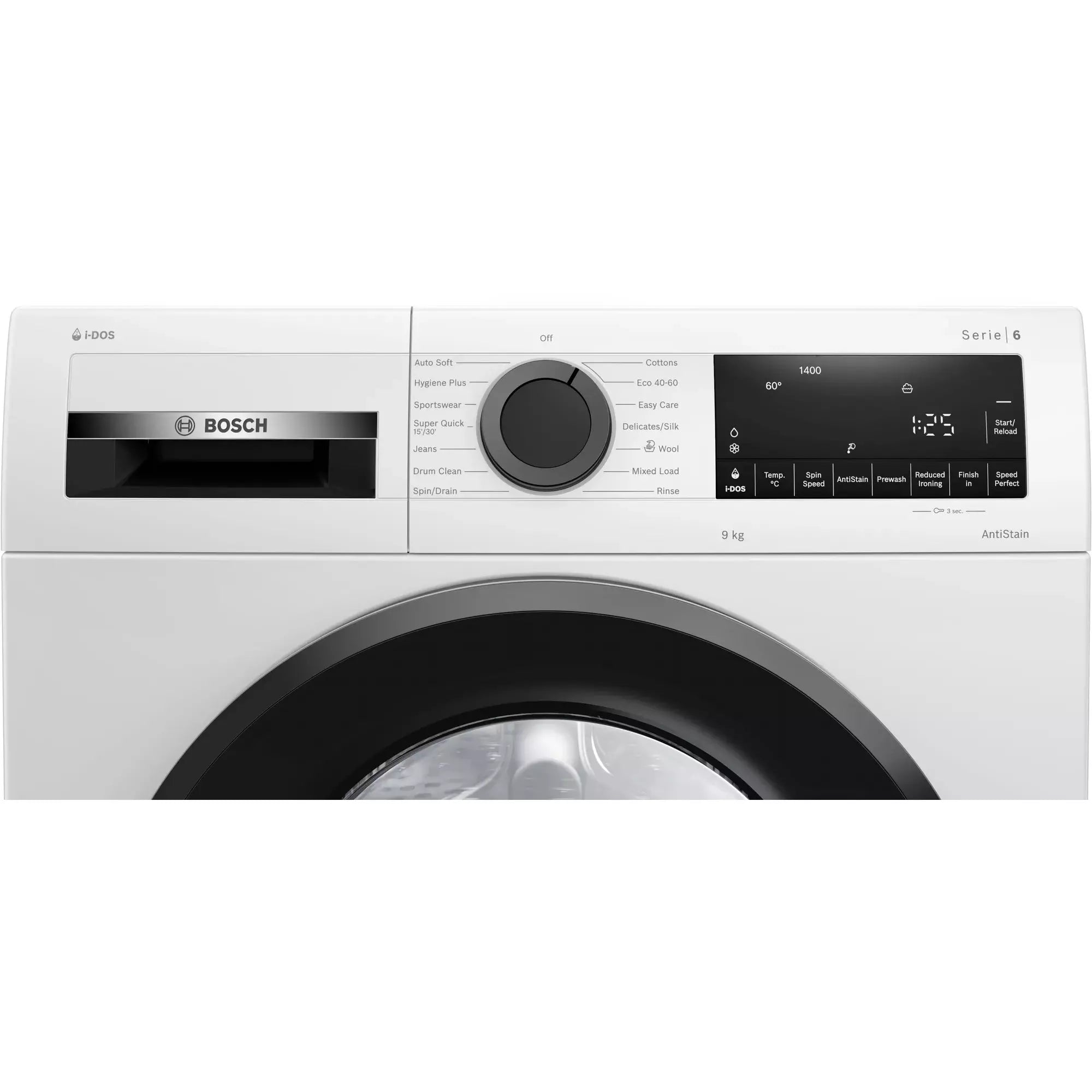 - Touch control buttons: Reduced Ironing option, Ready in, stain selection, i-DOS 2.0, start/pause with reload function, Temperature selection, SpeedPerfect, Prewash, Spin speed reduction/Rinse Hold