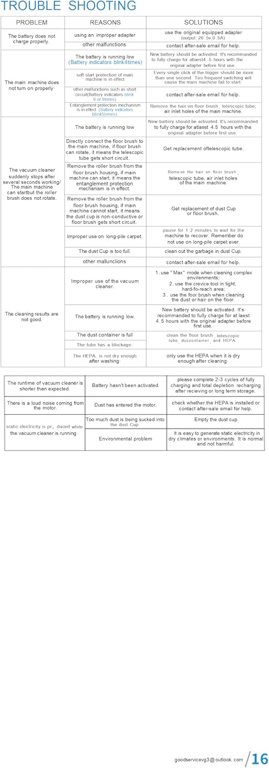 - 【IMPORTANT NOTE】Please ensure to use the original adapter (with "Vacuum VG3 " words) to avoid any abnormal charging or damage to the battery. If it ceases operation, please clear any debris from the floor brush and the air intake. It is recommended for use on short pile, hardwood, or tile floors. On long pile carpets, the high-speed mode runtime may last less than 10 minutes, while the low-speed mode may last less than 20 minutes. This is normal.
