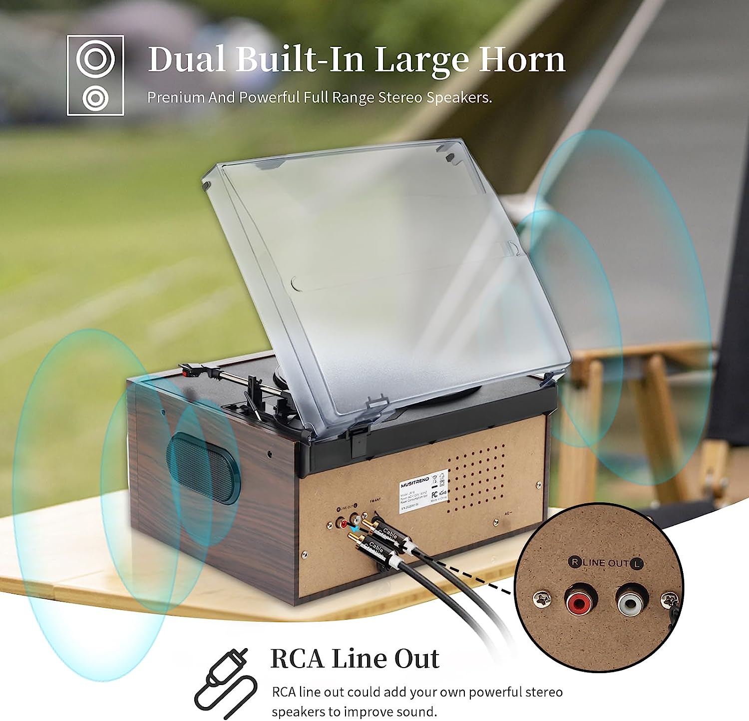 The record player equips with 2 Bulit-in powerful separate speakers, loud enough for most scenes. You can enjoy the stereoscopic,real and live vinyl audio in dual speakers.
