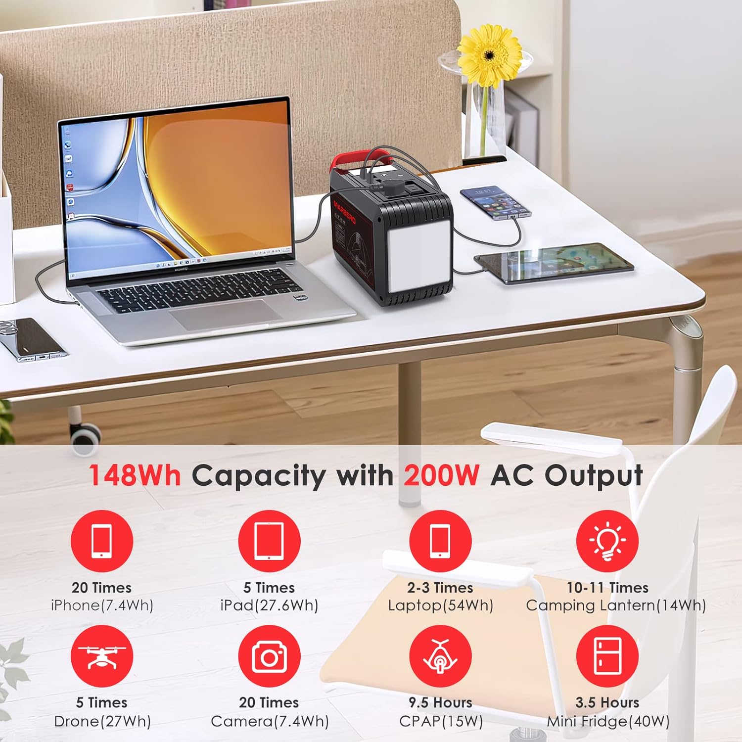 - COMPACT & PORTABLE DESIGN: Super slim size(6.5 x 4.6 x 3.1 inches), the portable power station is about the size of a basic DSLR; With the strong yet lightweight(3.2lbs) plastic case, plus an ergonomic handle, it's quite suitable for outdoor camping, road trips, backyard camping, home, school, office,etc.