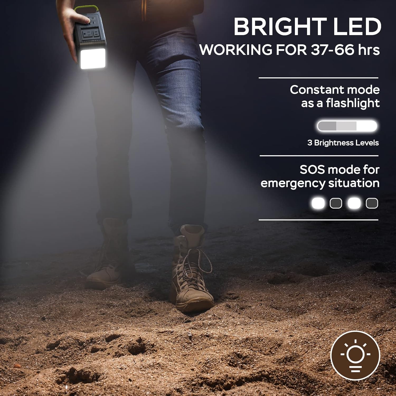 - BRIGHT LIGHTS: With three levels of brightness, the portable power bank can be used as a professional flashlight when needed, which is very suitable for use when the car breaks down, power outage at home, or a tent power supply. The 1st level can be used for 68hrs(light up a small room), the 2nd level can be used for 48hrs(lighting for walking at night), and the 3rd level can be used for 37hrs(light up the living room). There is SOS mode, use the international SOS frequency for help.