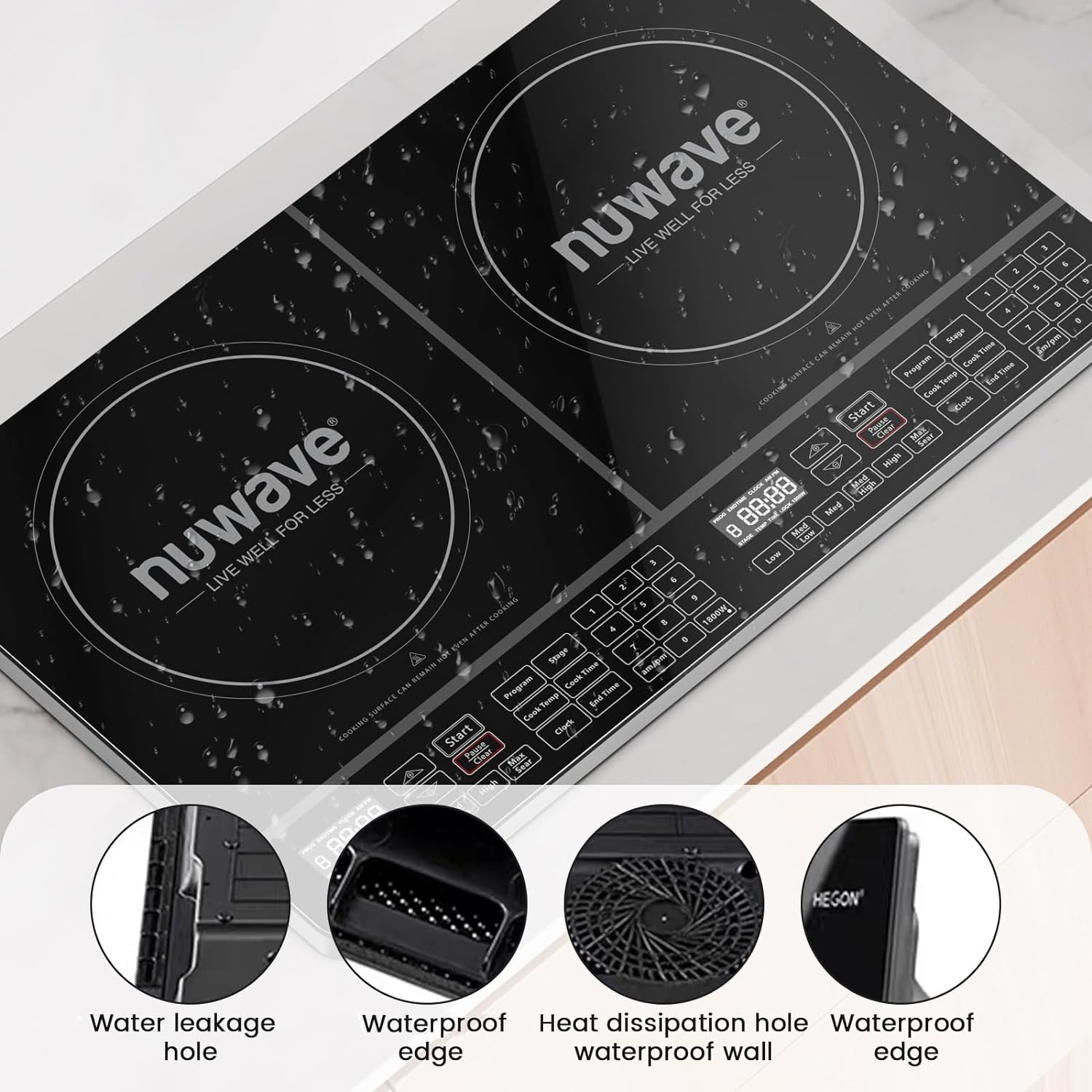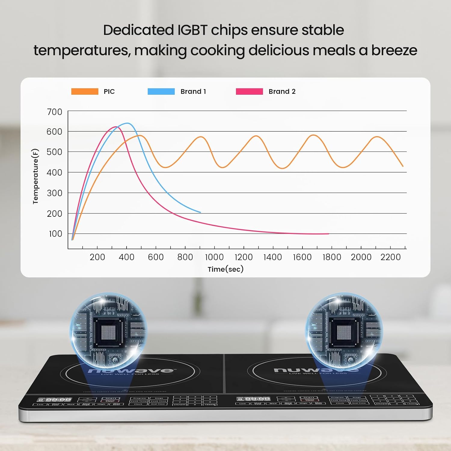 • Nuwave PIC Double, Portable, Powerful 1800W with 2 Large 8” Heating Coils, Independent Controls, 94 Temp Settings from 100°F to 575°F in 5°F Increments, 11.5” Shatter-Proof Ceramic Glass Surface