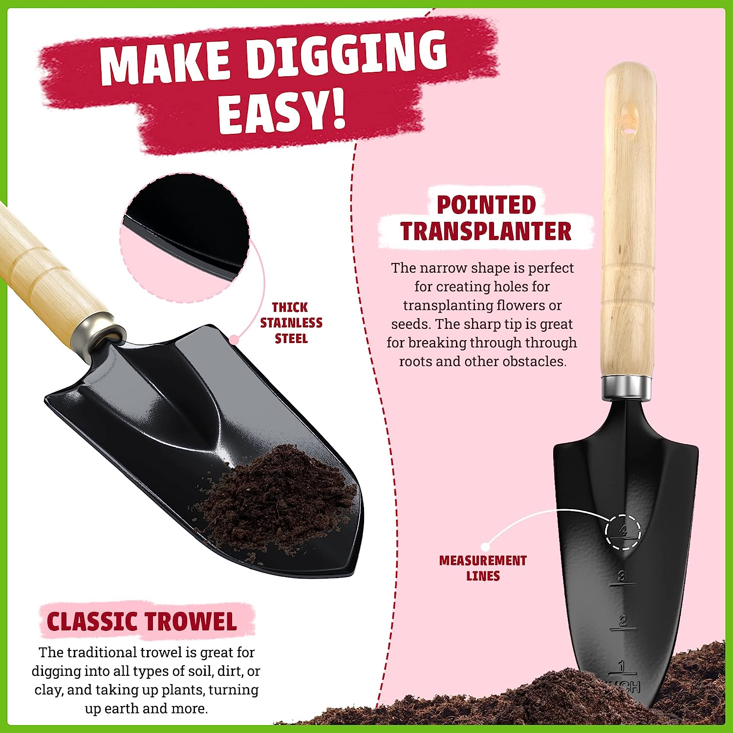 • STAINLESS WITH WOODEN HANDLE: The tools are intentionally made with stainless steel heads, ergonomic wood handles and holes for convenient storage and higher durability level.