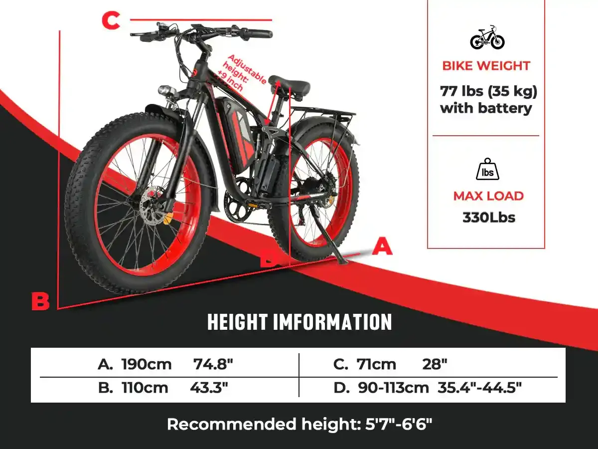 | Bike Dimension | Seat Height 35.4”-44.5“ (90-113 cm) / Length 76.4” (194 cm) |