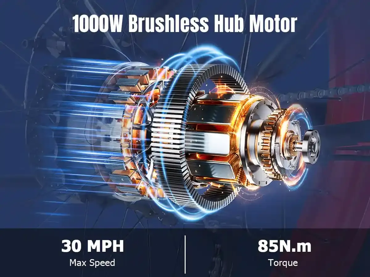 | Motor | 1000 watt (1200 watt peak), 85 N.m, toothed, brushless hub motor |